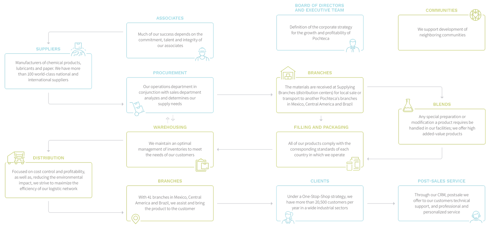 A key aspect of our company’s success is our integrated supply chain. Pochteca’s operations strategy encompasses all areas of the company. We set common objectives such as EBITDA and sales targets based on Sales & Operation Planning (S&OP).