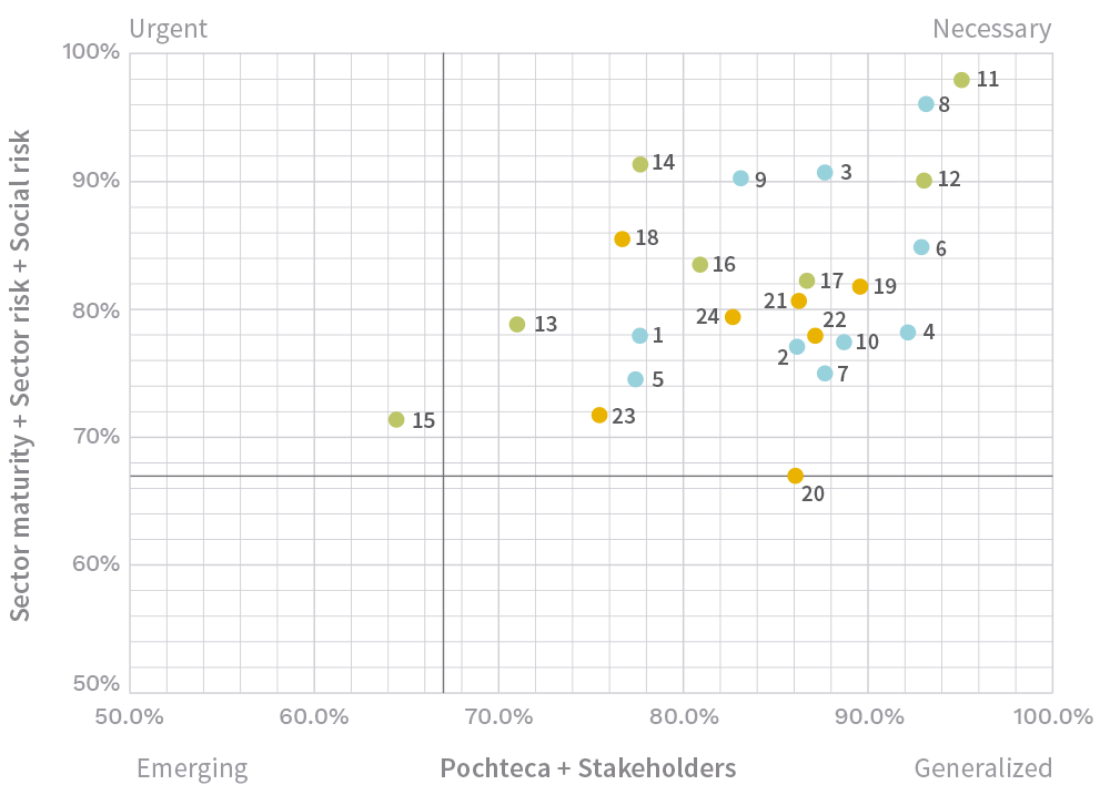 The materiality analysis’ methodology referenced a benchmark between the maturity of major companies in the specialized consumer chemical products distribution sector, and the risk characterized by sectorial and social prescriptors –whether legally binding or voluntary– in economic, social and environmental matters. The study included a review of public information from four major companies in the sector dedicated to the distribution of specialized consumer chemical products as well as four sectorial and four social prescriptors.